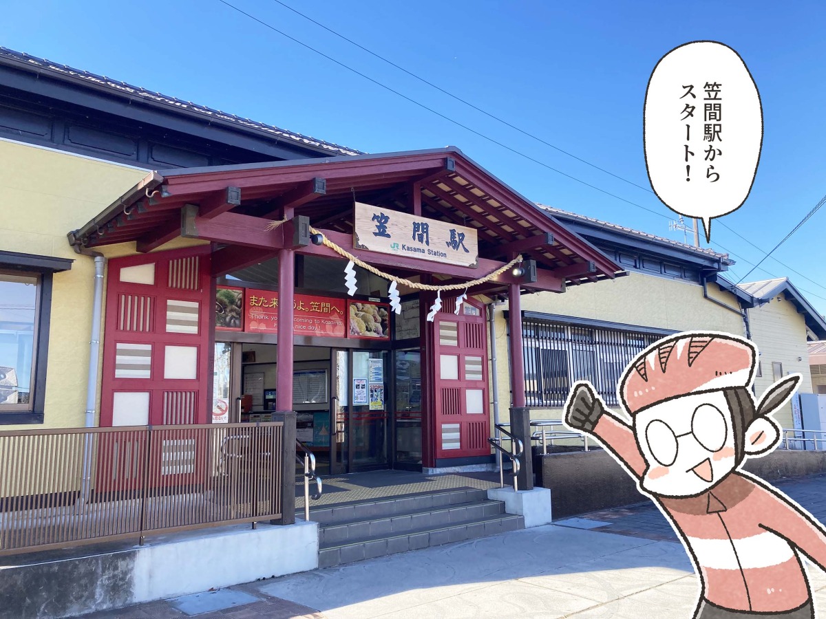 その冬装備でやって来たのは茨城県笠間市。JR水戸線の笠間駅からスタートです。笠間市といえばパワースポットとしても有名な笠間稲荷神社ですが、駅も神社をモチーフにしたデザインになっていますよ。