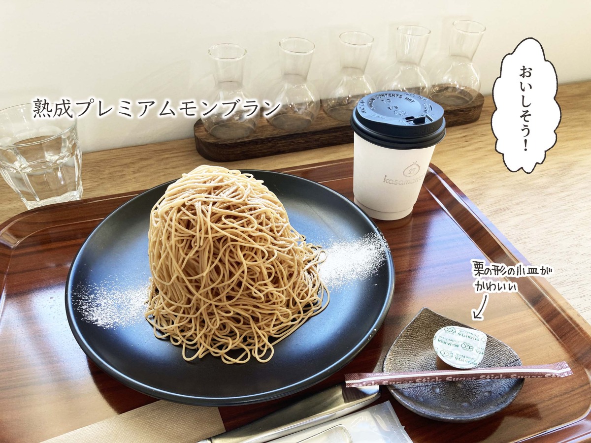 野球の練習風景を眺めながらいただいたのは「熟成プレミアムモンブラン」。笠間産の和栗を収穫後一定期間0℃前後で冷蔵熟成し、甘みを最大限に引き出した砂糖不使用の栗ペーストを使用しているんだそう。栗の甘さと香りを味わえる栗ペーストの中にはクリームやスポンジ、サクサクのメレンゲ、大きな栗が一粒入っていてボリューム満点なのにしつこくないのでペロリといただけちゃいます。窓からサイクルラックが見えるので、ゆっくり味わうことができました。