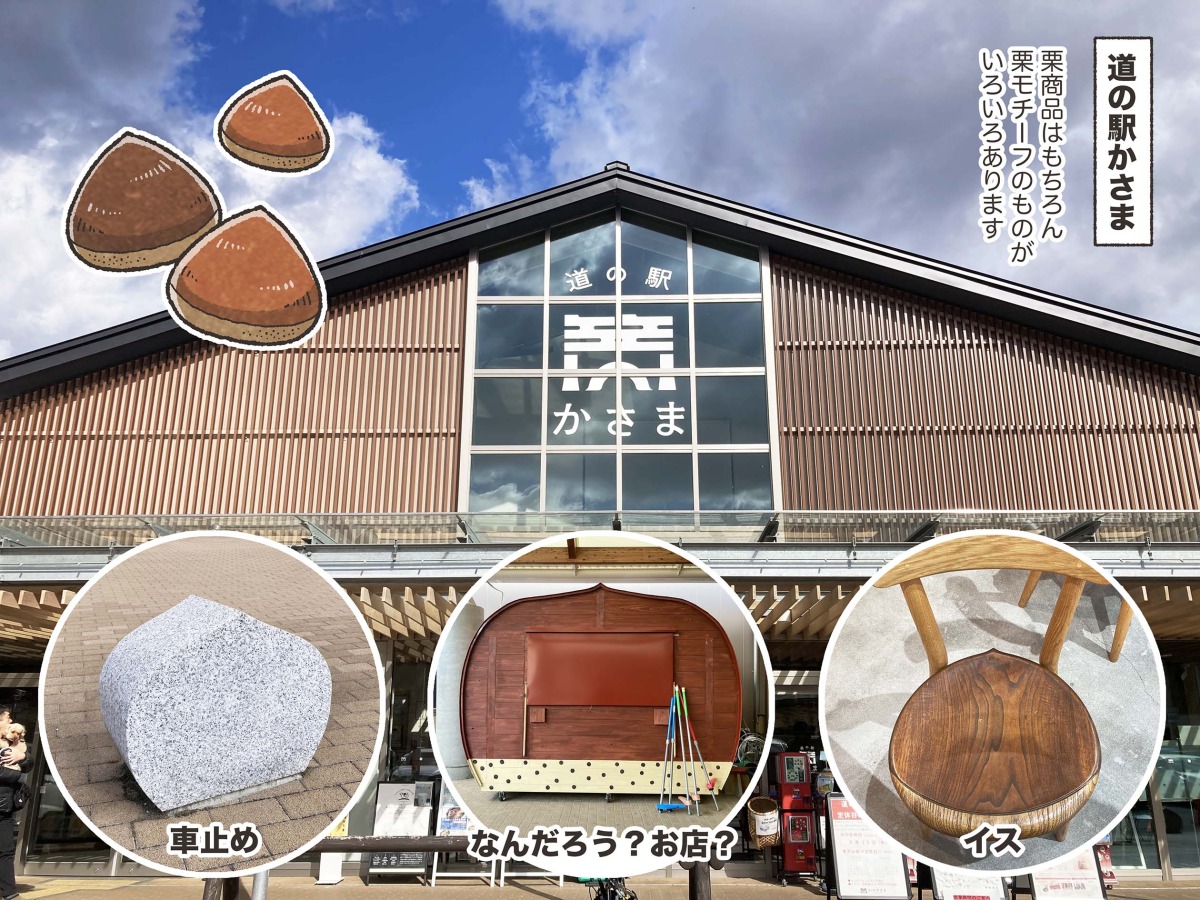 「道の駅かさま」に到着。あちこちに栗モチーフのものがあります。なんとなく建物自体も栗に見えて来ますね。直売所にはたくさんの栗商品が販売されていて、秋にはツヤツヤとした大きな生の栗も販売されていますよ。