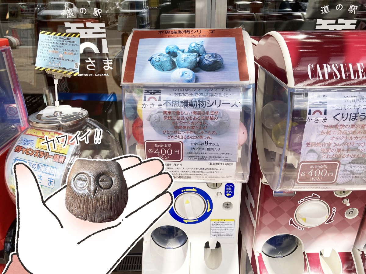 笠間は笠間焼きでも有名なんですが、自転車だとなかなか買って帰ることが難しいですよね。でも手のひらサイズのものなら大丈夫。かわいいフクロウの置物が出ましたよ。笠間焼きのカプセルトイは6台設置されており、焼き物作家さんごとにわかれているようです。