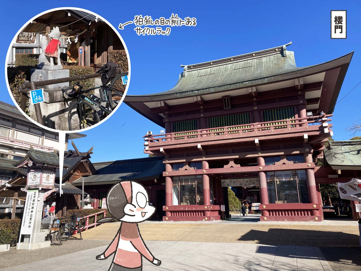 赤い大鳥居の先へと自転車を押して進むと、楼門前の狛狐の目の前にサイクルラックがありました。設置されているのだから使用していいのだろうけど、ちょっとドキドキしながら掛けさせていただきました。