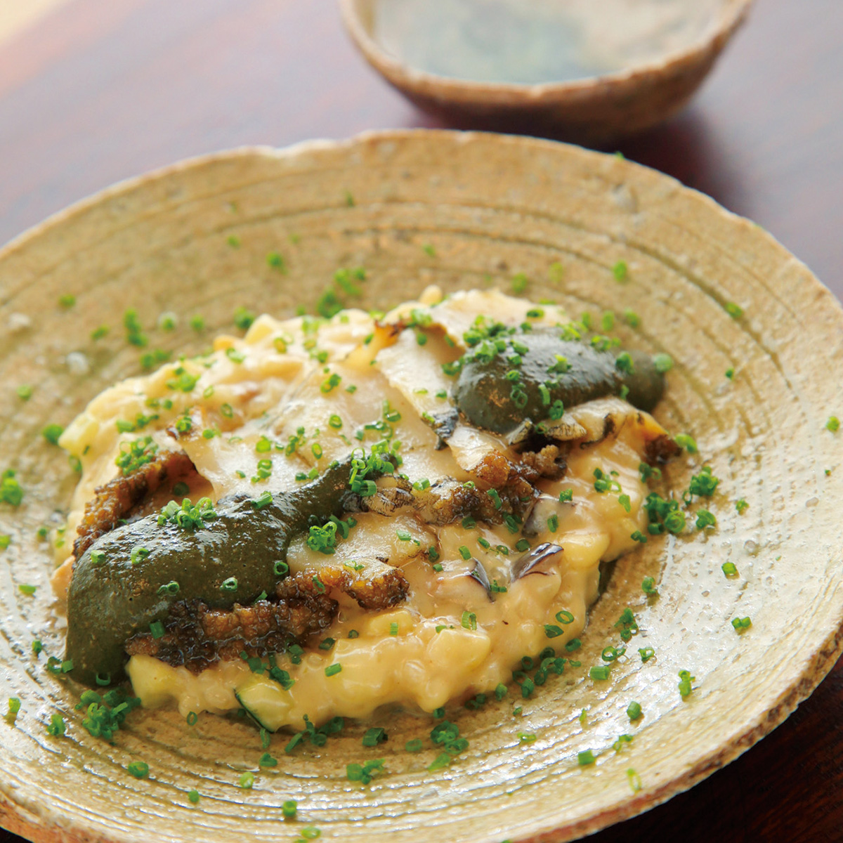蝦夷鮑の肝をソースにしたリゾット。「宗玄」は常温熟成させた状態から44°Cまでゆっくり温度を上げ、鮑の旨味をさらに広げる。