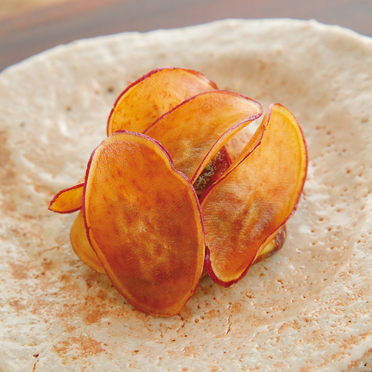 さつまいもチップスの中には、無花果と生落花生を混ぜた牛肉のタルタルが。「奥播磨」は55°Cに一気に上げた後、48°Cに下げる。