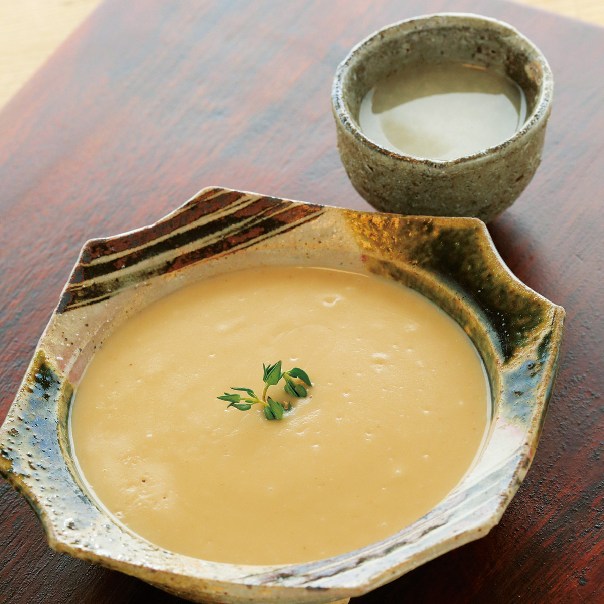 栗とピータン、2層のポタージュ。アルコール度数18度の「どぶ」は加水し15度に落とし、50°Cで提供。栗の味がにごり酒に移る。