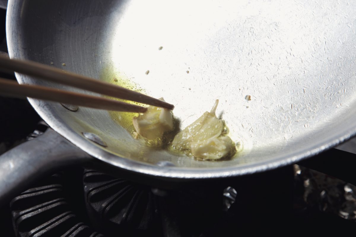 フライパンにオリーブオイルをひき、ニンニク(包丁の側面を使って潰し、芯を取り除いておく)を入れ、香りが立つまで弱火でじっくりと炒める。