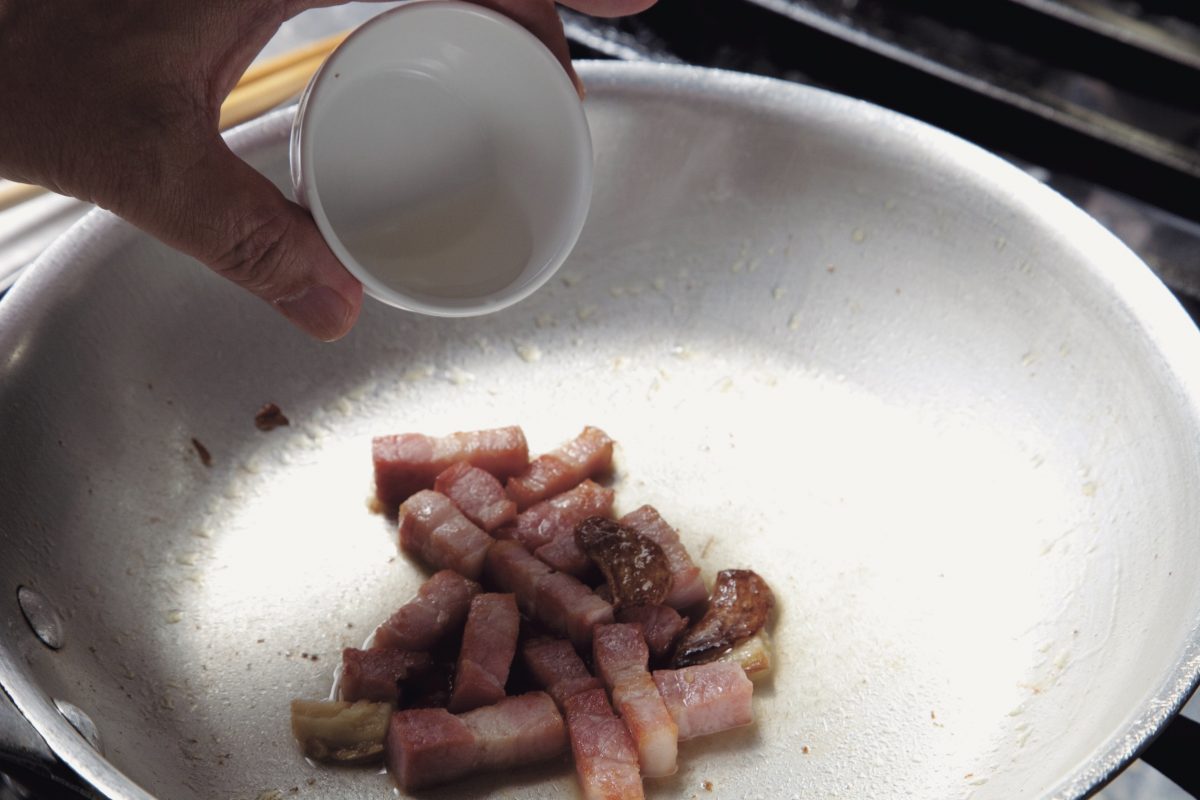 ニンニクの香りが立ったら、弱火のままベーコンを投入する。ベーコンの表面がカリっとなり、ほんのりキツネ色になるまで、5分程度弱火で炒める。