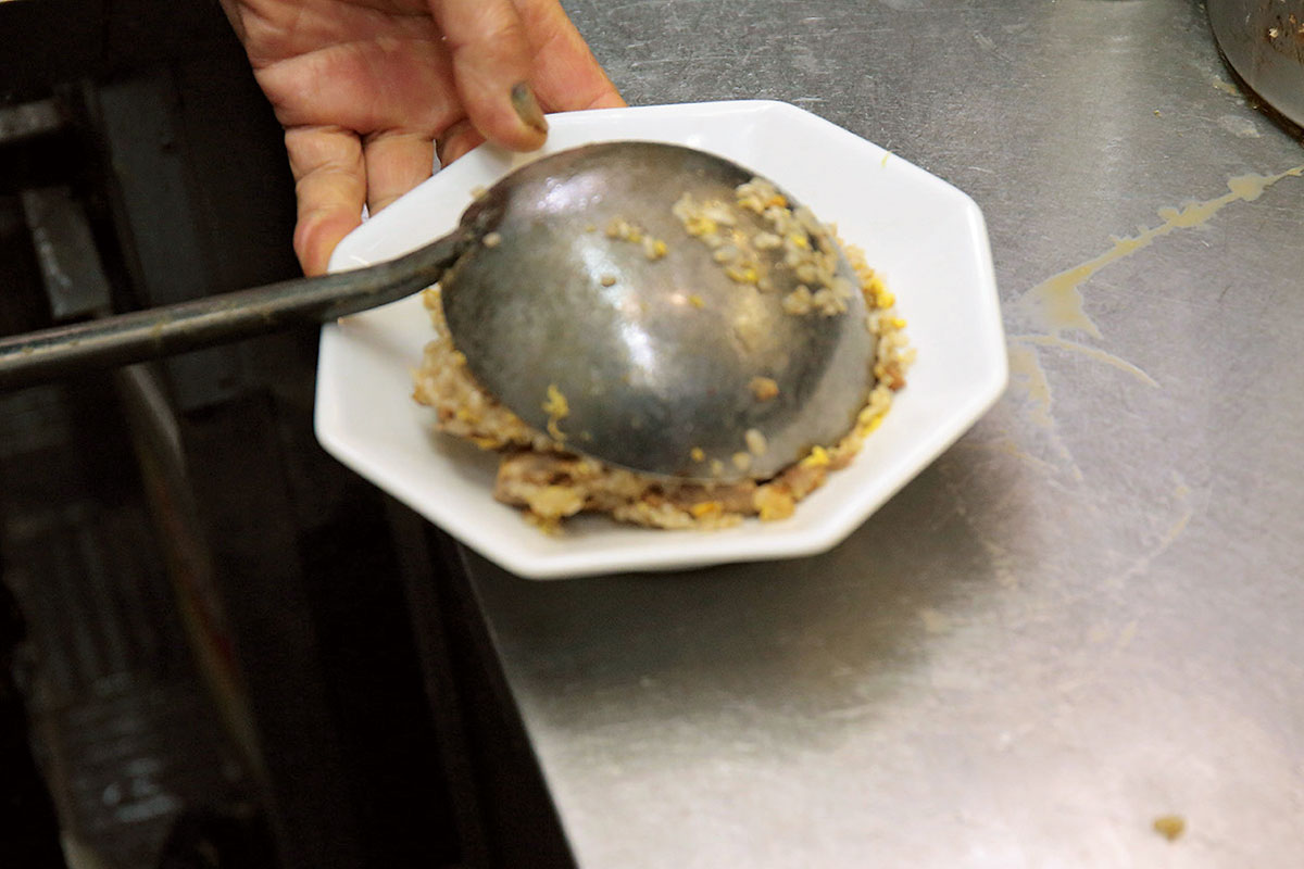 六角皿を手に持ち、お玉を近づけ、お玉を返してチャーハンを皿へ半球状に盛りつける。