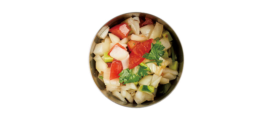 1. 玉ねぎとキュウリ、トマトを粗みじん切りにする。