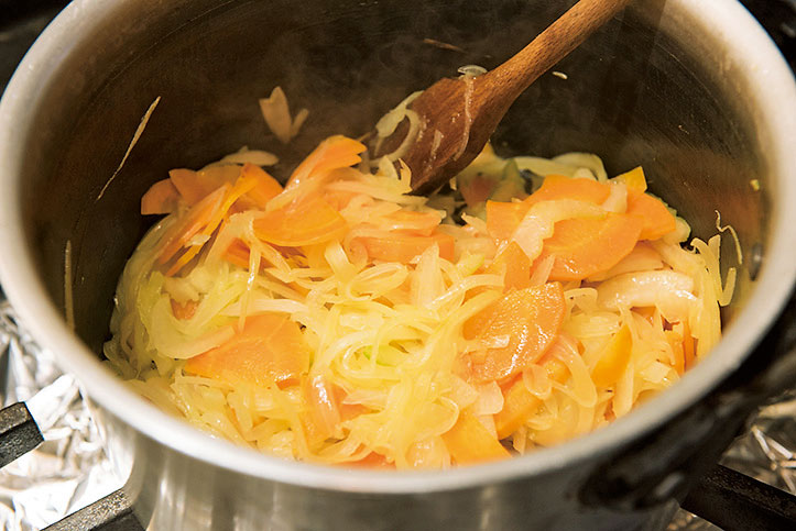 厚手の鍋に炒め油(分量外)を入れて中火にかけ、薄切りにした野菜を一度に加える。ときどき混ぜながら5分ほど透明感が出るまで炒める。