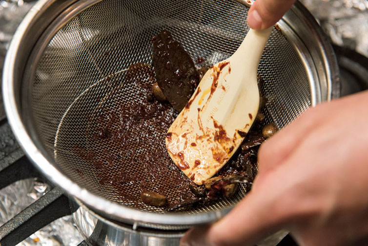 好みのとろみに煮詰まったら、仕上げに残りのバルサミコ酢を加え、網でこす。