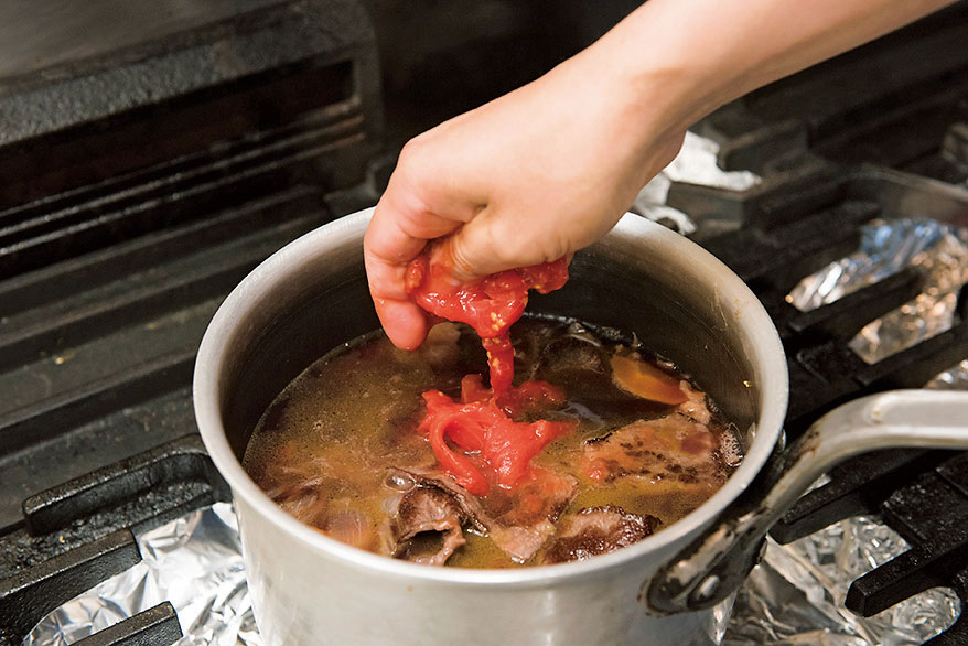 バローロと水、ニンニク、粗塩、水煮トマトを手で潰しながら加え、火を強め、沸騰したら中火に落とし、アクを取りながら40分~1時間煮込む。