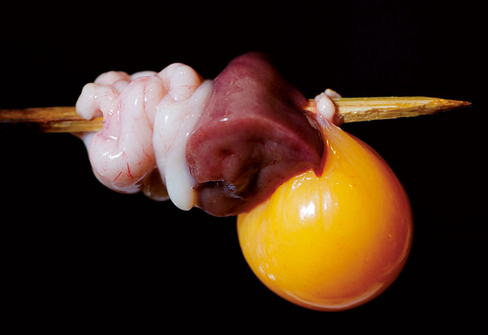 「ちょうちん」は卵管、レバ、未成熟卵の順番で打つ。最後の卵は薄い皮の部分のみに串を入れる。卵に刺すと黄身が流れ出てしまうから、慎重な仕事だ。