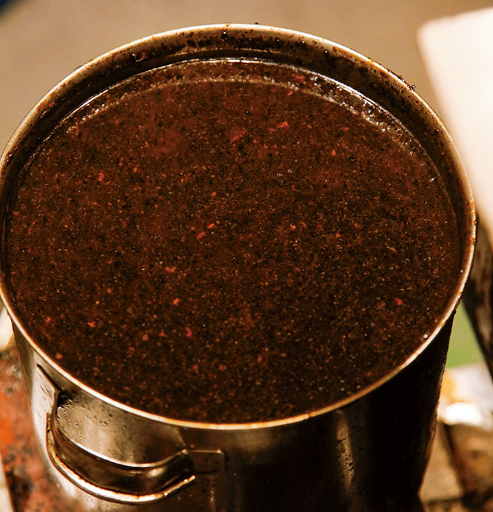 家のガス火の場合は、金串を使い肉を平らにして刺すと焦げ防止になる。タレは醤油・みりん・ザラメだけで良し。みりんを火にかけ酒分を飛ばして醤油を合わせ、好みの量のザラメを入れる。店では甘みの少ないサラッとした仕上がりにしている。