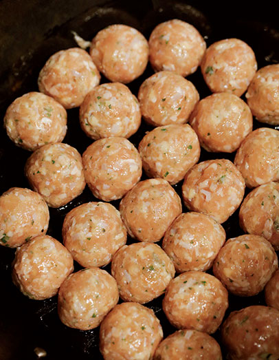 「つくね」は絶妙な肉の食感を残す挽き具合。一度フライパンで表面を焼き、串打ちしながら、改めて形を整える。