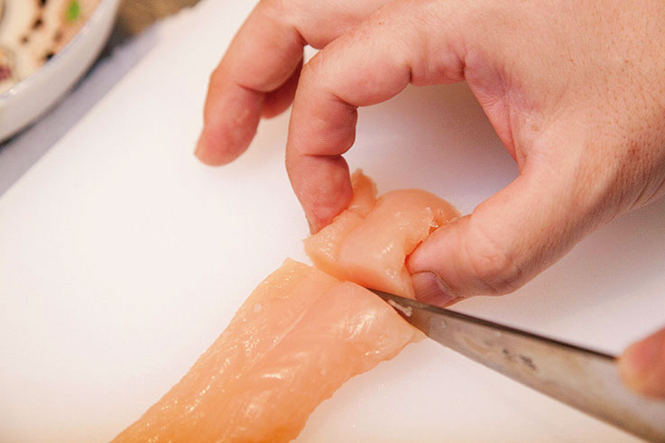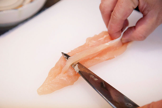 筋に沿って上下に切れ込みを入れ、筋を切り取る。