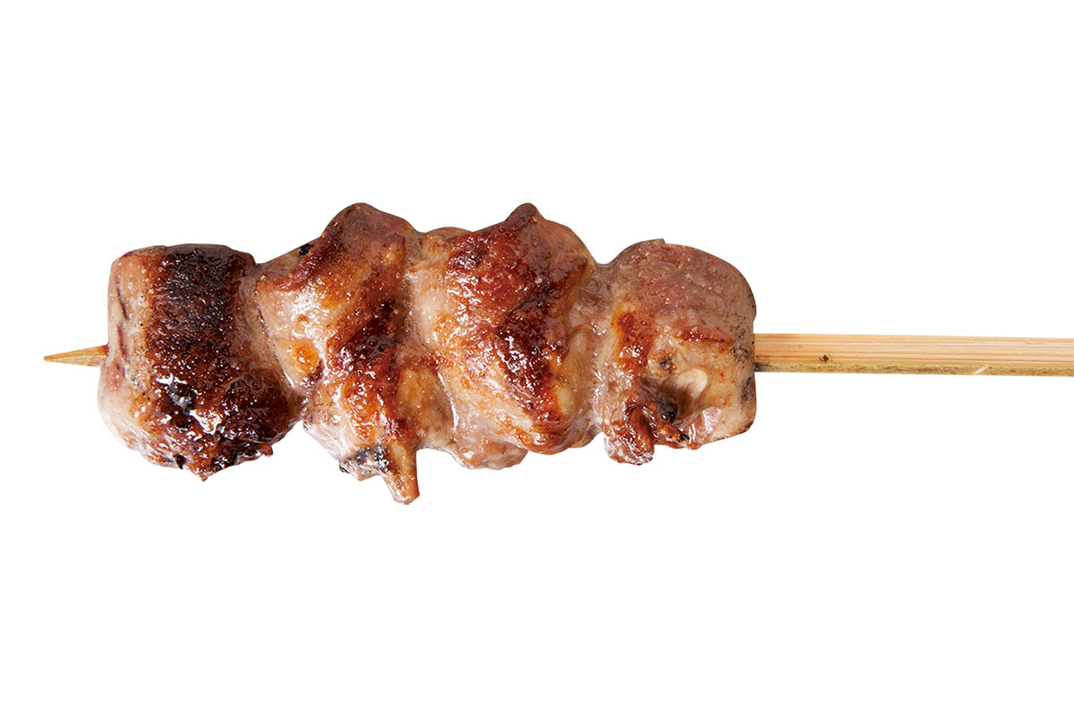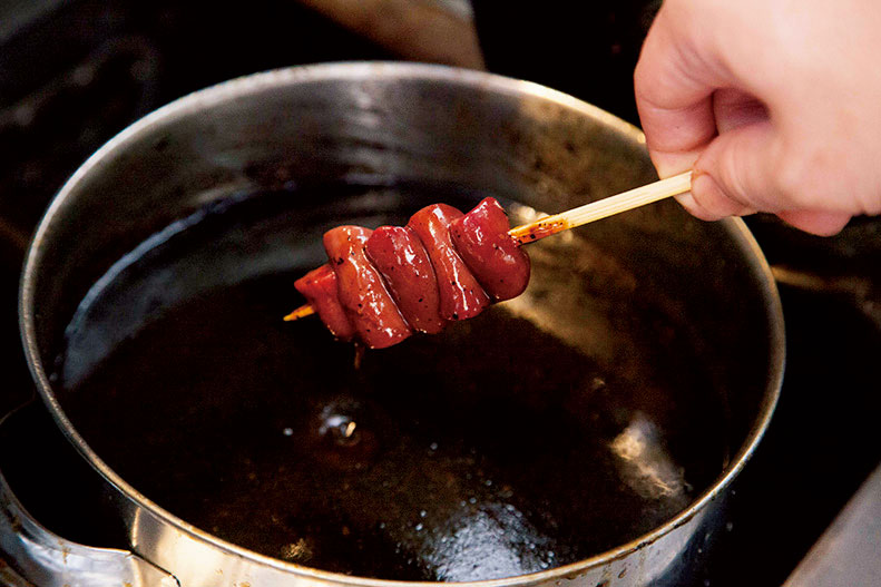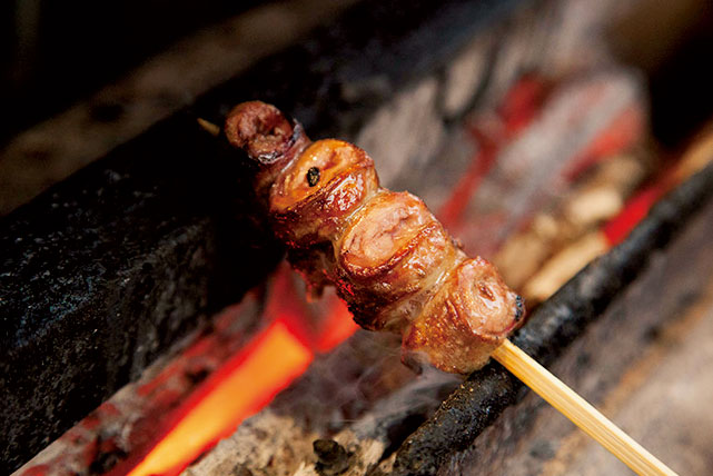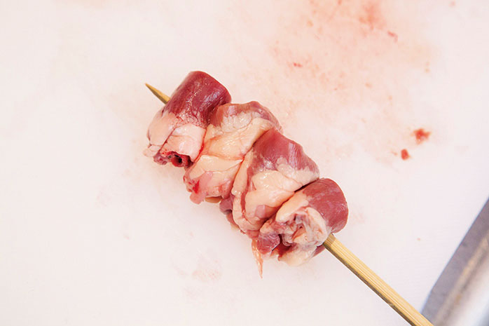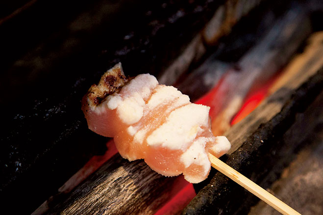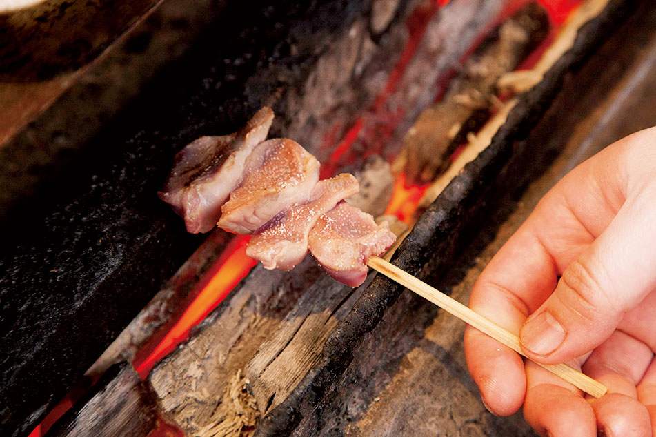 「大きさを揃えて切ることはもちろん、レバやハツは身がやわらかく、焼く時に身が垂れると焦げてしまう。必ず巻き込みながら串に刺すことが重要」と串打ちの大切さを説く。串は一番下に小さい身を刺し、末広がりにすると美しい。肝心の焼き方の極意は肉質を掴み部位の個性を引き出すこと。鶏肉は一度火が入ると、一気に火が通る。