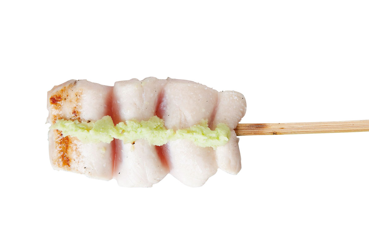 塩を振って焼き、軽く色が付いたら裏返す。数回返し、最後に先端に塩を振りわさびをのせる。