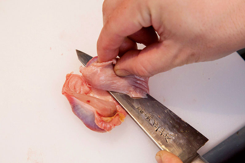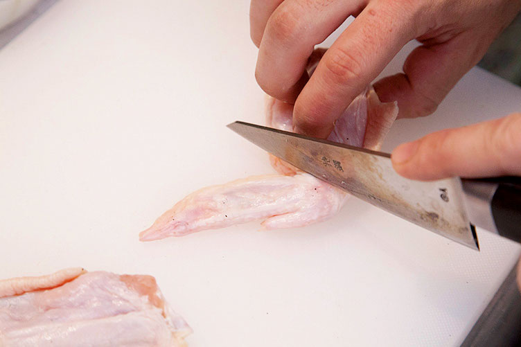 太い骨と細い骨の付け根に沿って切れ込みを入れ、端肉を切り落とす。