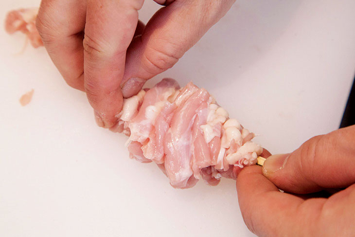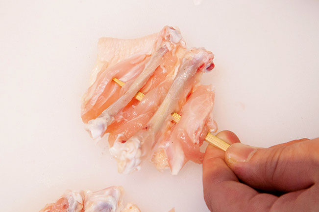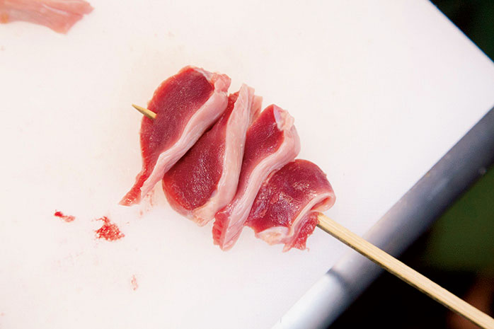 2cmの身から串に刺し、小さい肉は身が垂れないように折って刺す。