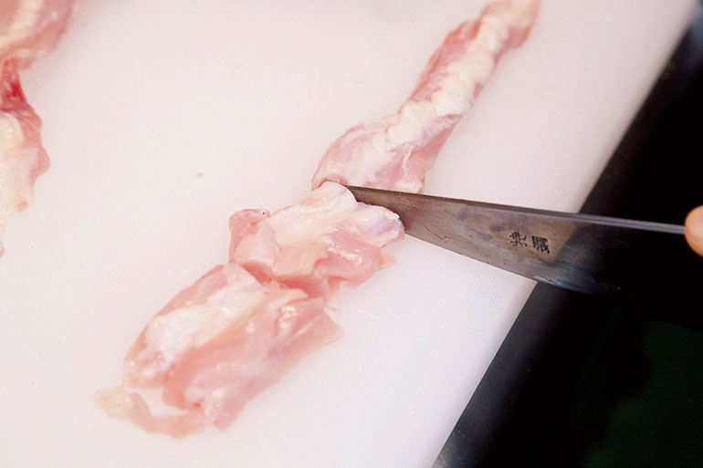 「かしわ」はもも肉をすね側・もも側に分け、細かな骨を取り除き、食べやすい大きさに切り分け、串を打つ。