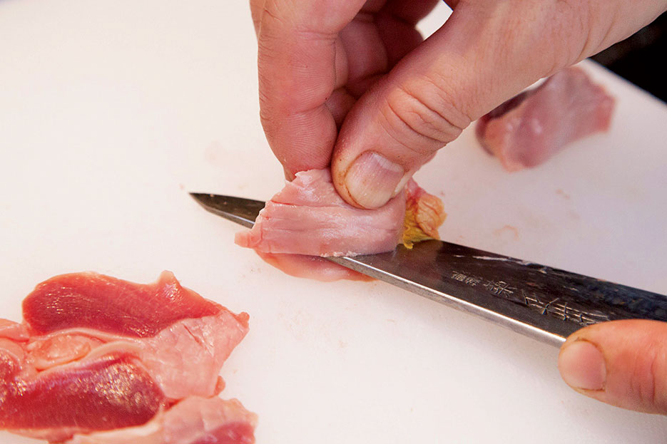 2羽分を用意し、1切れ約2cm、1cmの2種類に切り分ける。