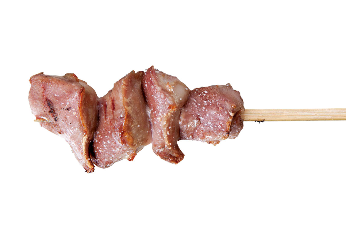 家のガス火の場合は、金串を使い肉を平らにして刺すと焦げ防止になる。タレは醤油・みりん・ザラメだけで良し。みりんを火にかけ酒分を飛ばして醤油を合わせ、好みの量のザラメを入れる。店では甘みの少ないサラッとした仕上がりにしている。