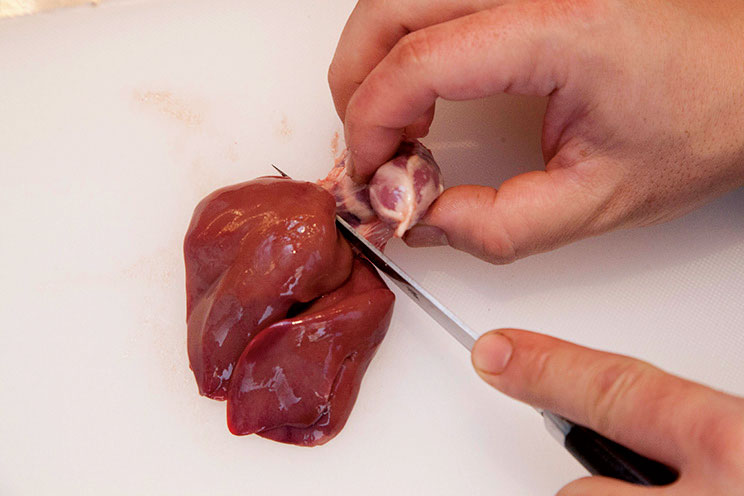 レバの血管部分と端肉をそぎ落として、約2cmに切り分ける。