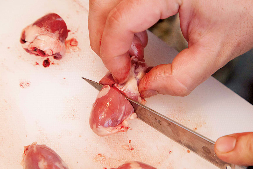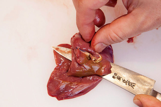 レバとハツを切り分け、ハツを落として薄皮を剥がし半分に切る。