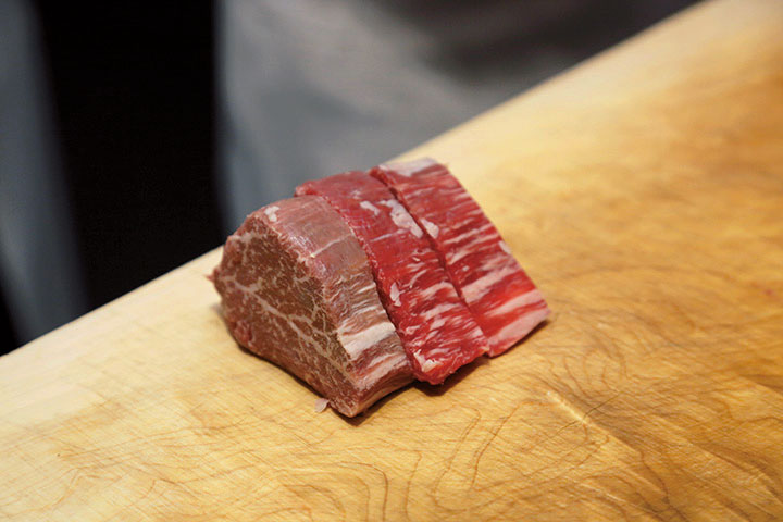 「うちは和牛であることにはこだわりますが、特にブランド牛にはこだわりません。また、A5などの肉質のランクもそれほど気にしません。ランクに関して言えば、肉の専門家が決めているだけであって、料理人が決めているわけではありませんからね。A4・A3の肉でも十分に美味しいですし、脂の入り方次第でくどくもなります。それよりも、料理に応じて肉を使い分けることが大切だと思っています。最終的に、美味しいか否かは、料理人や牛肉のランクを査定する人間が決めるわけではありませんからね」と熱く語ってくれた。