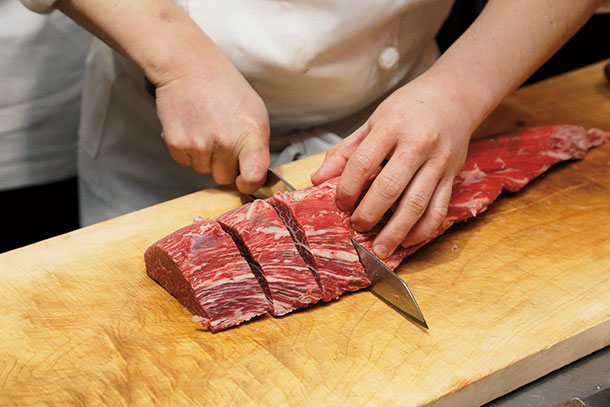 「うちは和牛であることにはこだわりますが、特にブランド牛にはこだわりません。また、A5などの肉質のランクもそれほど気にしません。ランクに関して言えば、肉の専門家が決めているだけであって、料理人が決めているわけではありませんからね。A4・A3の肉でも十分に美味しいですし、脂の入り方次第でくどくもなります。それよりも、料理に応じて肉を使い分けることが大切だと思っています。最終的に、美味しいか否かは、料理人や牛肉のランクを査定する人間が決めるわけではありませんからね」と熱く語ってくれた。