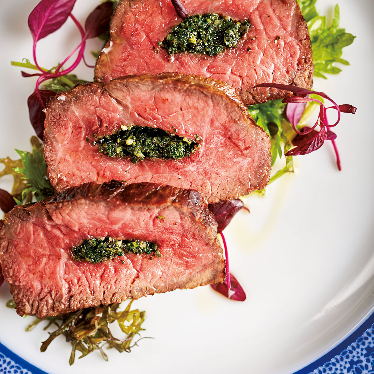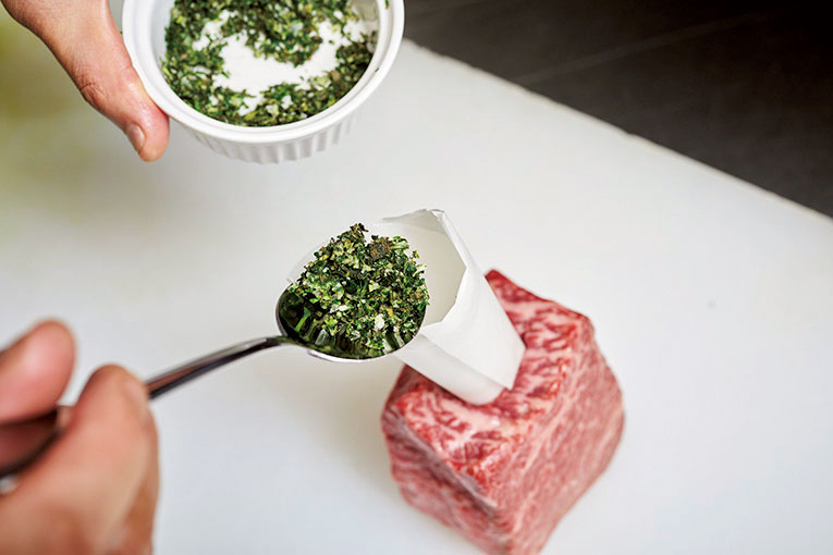 『カルネヤサノマンズ』の高山氏が弊誌のために特別に作ってくれたのは、ハーブをふんだんに使用した香草塩を詰め込んだローストビーフ。味わいが濃厚な和牛の内モモ肉で作る一品は、塩の味わいをダイレクトに感じながらも、肉の旨味も堪能できるプロならではのセンスが光る。美味しい肉さえ手に入れば、身近な材料で驚くほど簡単に作ることができる。付け合わせにアンズのジャムなど、甘みの強い果実のジャムを添えることで、さらに塩の味わいが引き立つ。