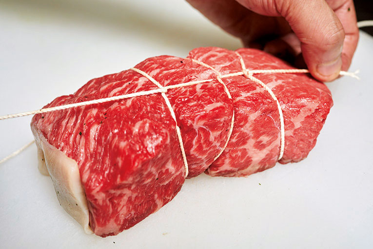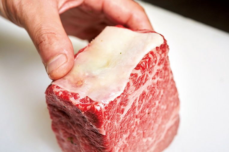 肉に塩を振ることで、浸透圧の関係で肉が保有する水分が外に出てくる。これは肉にとっての日焼けオイルのようなもの。水分を媒介して肉に火があたることで、肉の表面だけが焦げるのを防いで、じっくりと火入れができる効果がある。BBQなど、火が直接肉に当たる肉料理の際は、塩で肉のドリップを出してから焼くと失敗知らず。また、美味しい和牛の選び方のポイントは、ピンク色の肉ではなく、あずき色の肉を選ぶこと。色が濃い肉はメス肉であることが多く、オス肉に比べて柔らかくてジューシーだ。