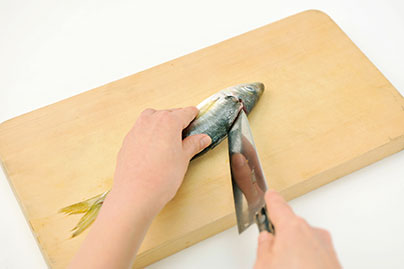 アジの背を手前にして魚を置き、頭の後ろから背骨まで包丁を入れていく。