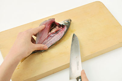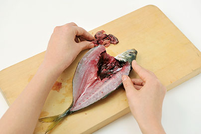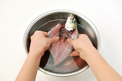 エラを取り内臓をキレイに取り除き、流水でよく洗う。取り残しがあると生臭さが出てしまうので念入りに。