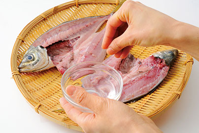 アジを塩水から取り出し、酒と塩を混ぜた酒塩をまんべんなく振りかける。