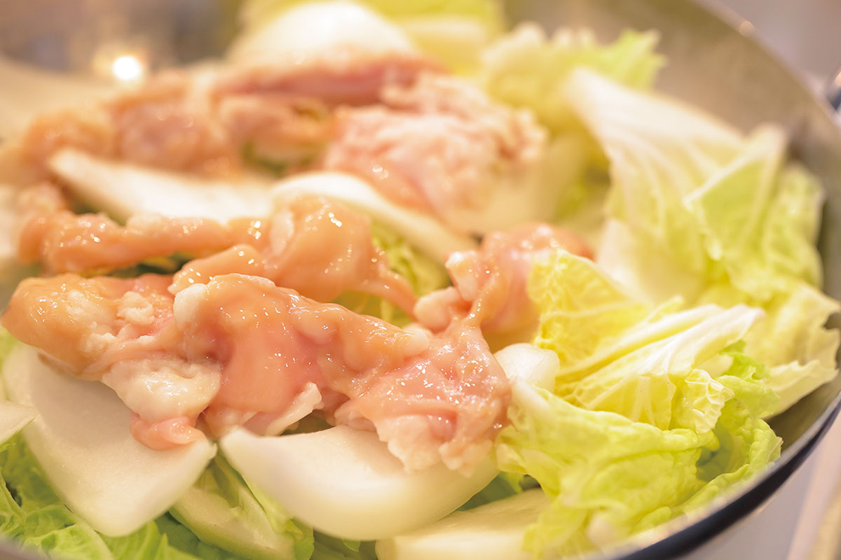 野菜と山形牛のホルモンがたっぷりと敷きつめられた鍋は、野菜や肉の甘みや旨味がタレに溶け込んで滋味深い味わいに仕上がっている。