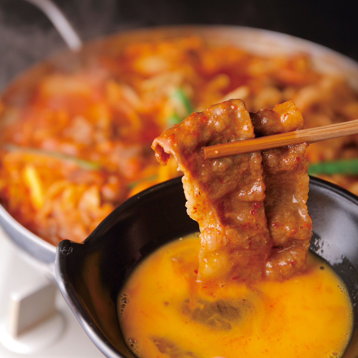 唐辛子と味噌、醤油や砂糖で作る自家製のコチュジャンとミヨシノ醤油が味の決め手の、絶品ピリ辛ダレがなべ肉の味の要になっている。