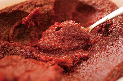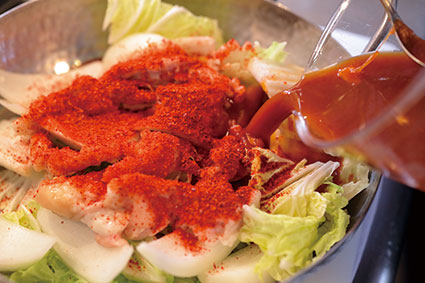 唐辛子と味噌、醤油や砂糖で作る自家製のコチュジャンとミヨシノ醤油が味の決め手の、絶品ピリ辛ダレがなべ肉の味の要になっている。