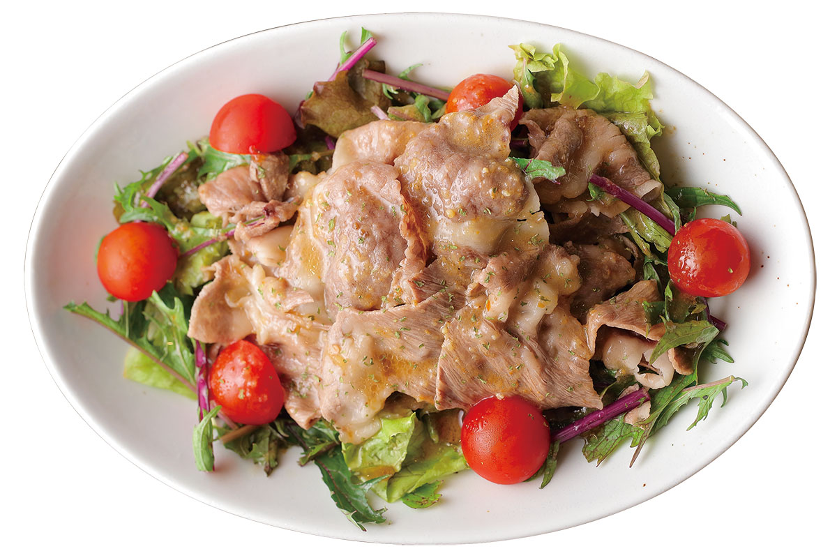 鰹出汁にくぐらせたロース肉をサラダの上にトッピング。