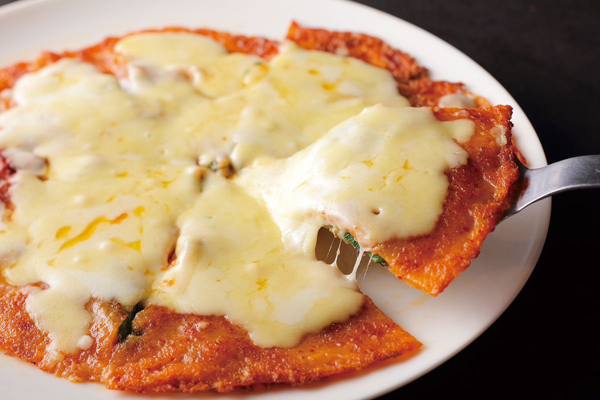 大阪・鶴橋から仕入れるキムチを入れ、サクサク、モチモチとした食感に仕上げるチヂミは韓国人も絶賛の味わい。