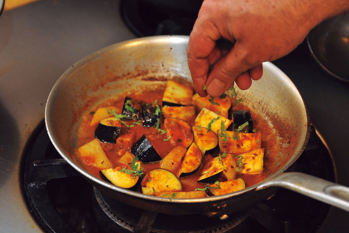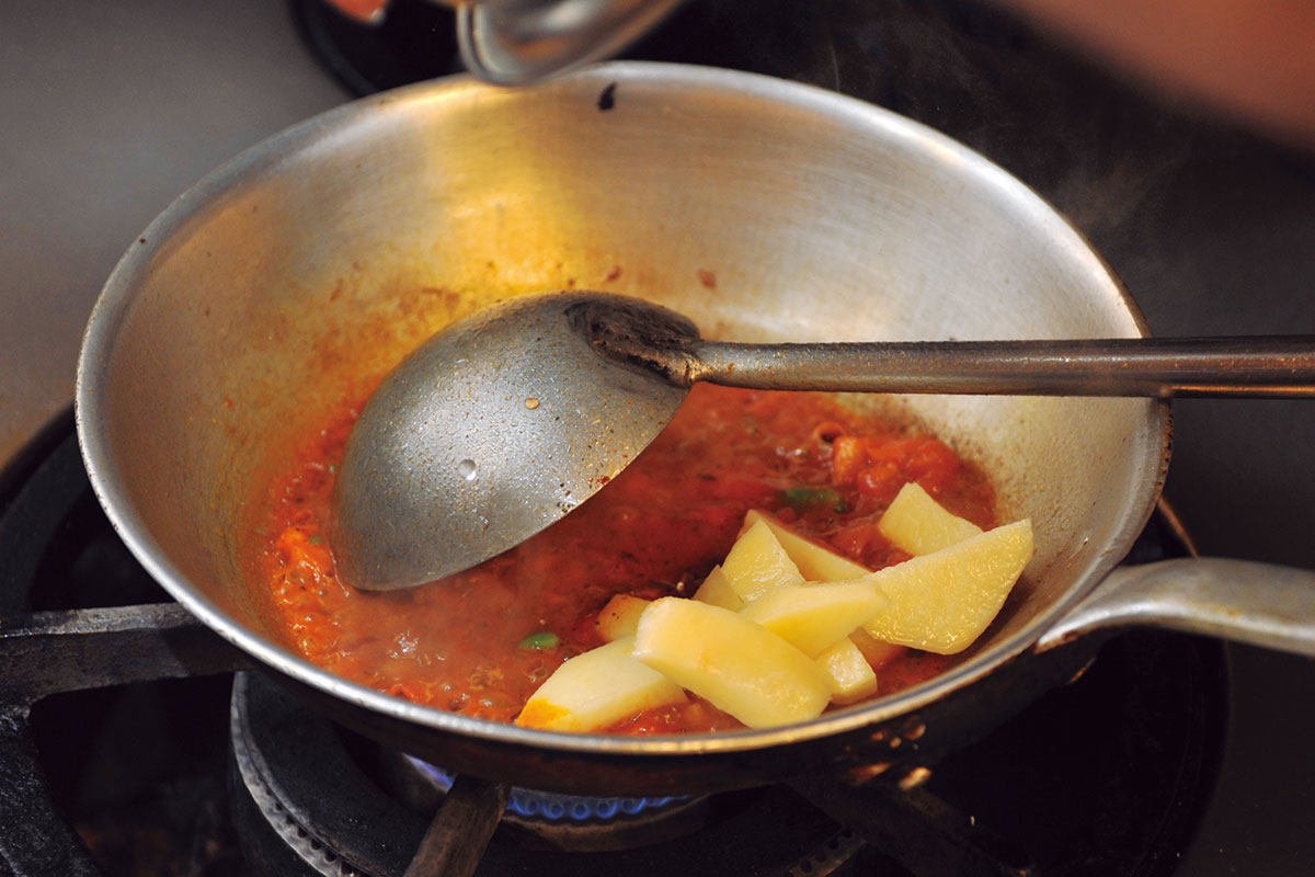 最後の仕上げは弱火で蒸し煮にナスを入れてスパイスを絡ませたら、炒めすぎずに弱火で蒸し煮にする。ナスやジャガイモの形を崩さず、水分の蒸発を防ぐためには、この調理法が一番。ナスも、トマトの汁気とスパイスの溶け出したオイルを程良くまとうことができる。