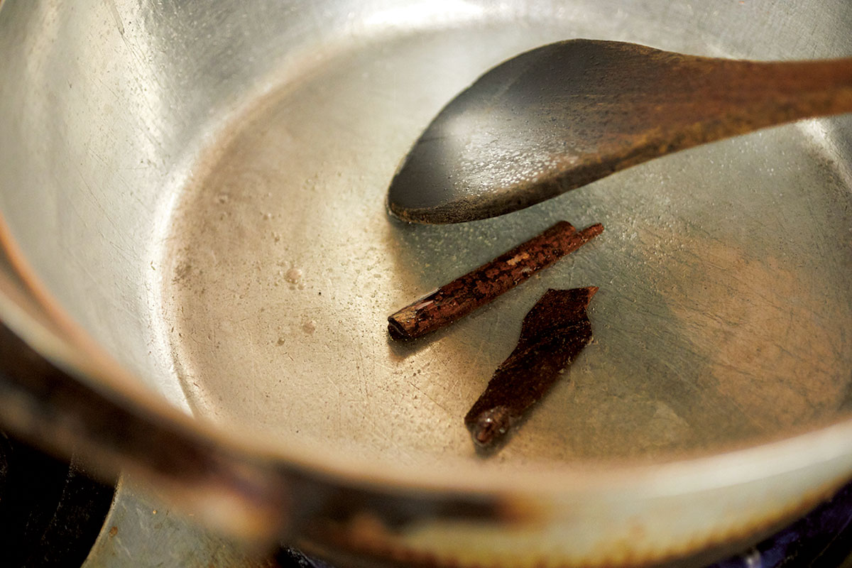 2. 鍋に油を温め、シナモンを入れて香りが移るまで加熱する。
