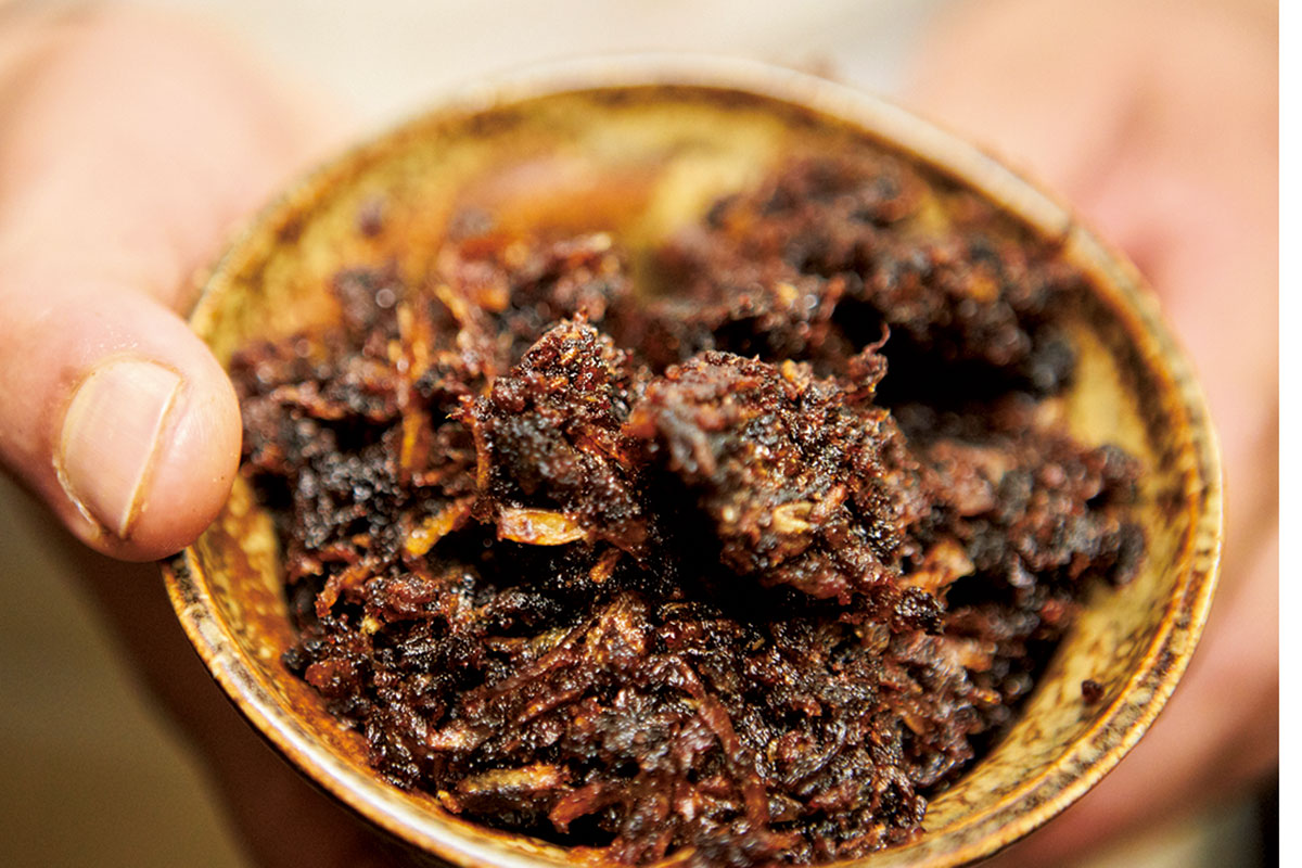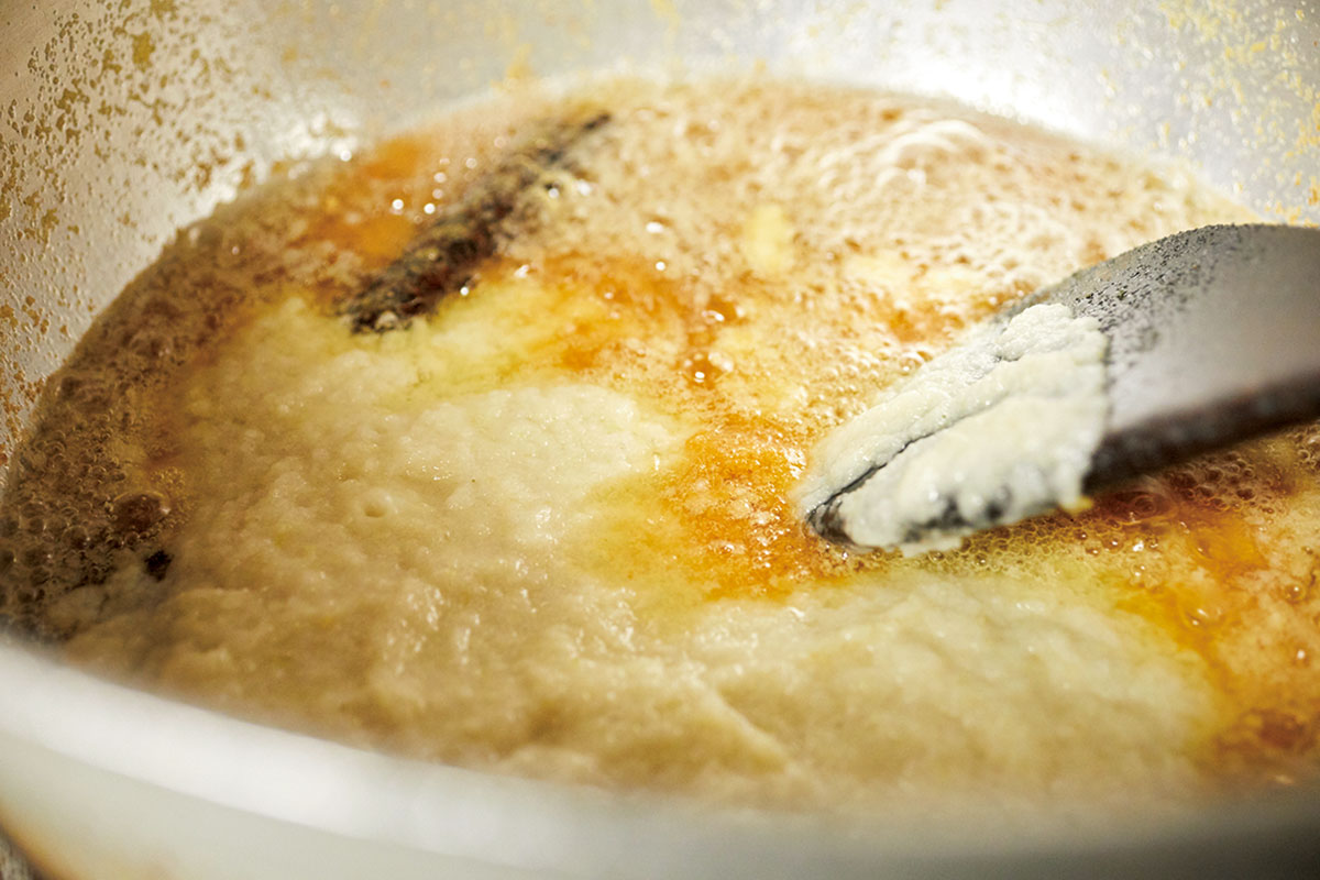 ここで使用したオリジナルのガラムマサラは、材料にある19種のスパイスの中から16種を調合したものだ。季節によって分量は微妙に変化するが、クミンとコリアンダーが多めでカルダモンは2種類を使い分けるのが特徴だ。スパイスを入れたボウルを火にかけ、香りを立たせてからミルで挽いて使用する。ピリリとした味わいが刺激的。
