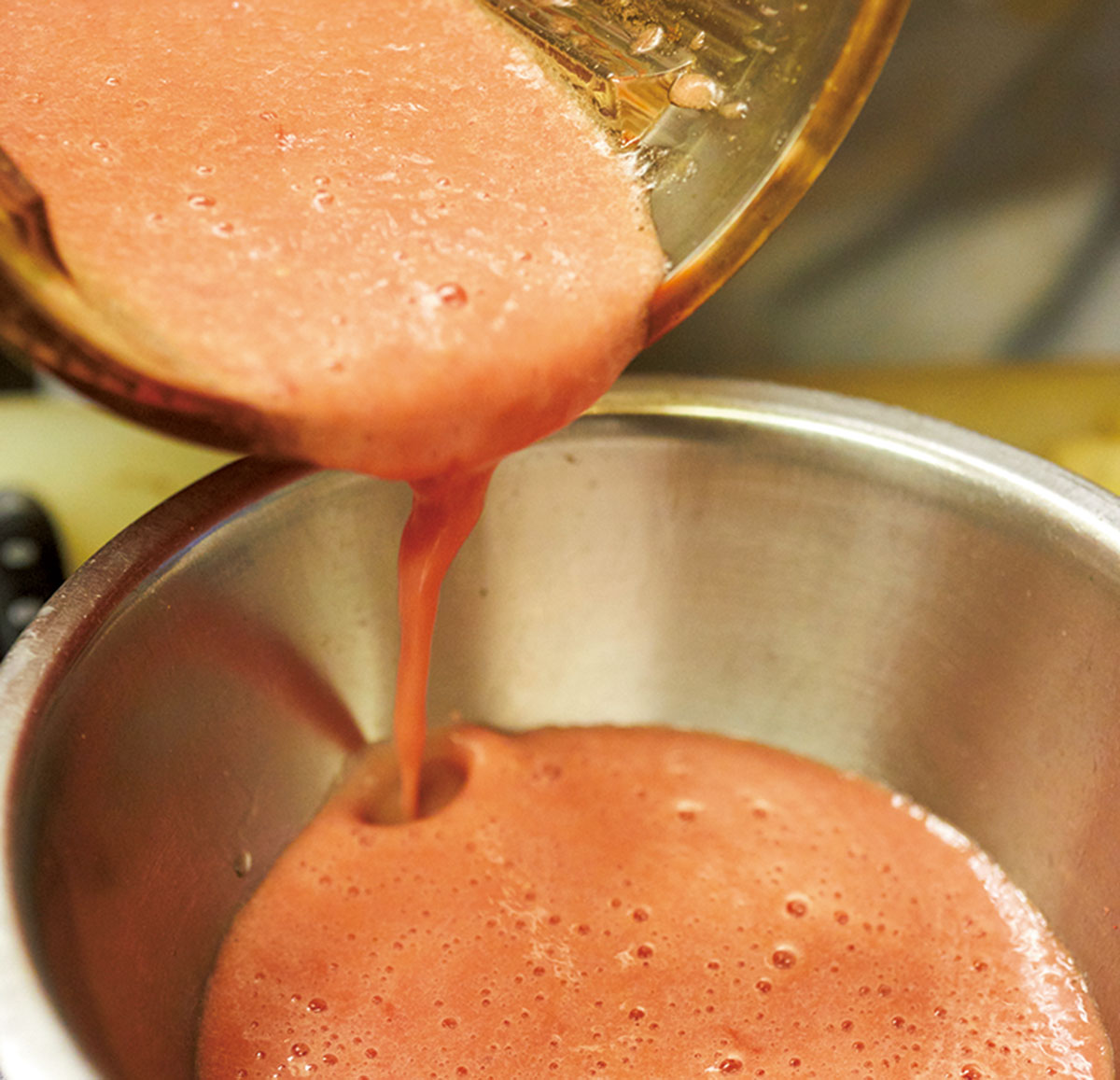 8. 火が通っていたらトマトをピューレにし、7に入れさらに弱火で15分程煮込む。