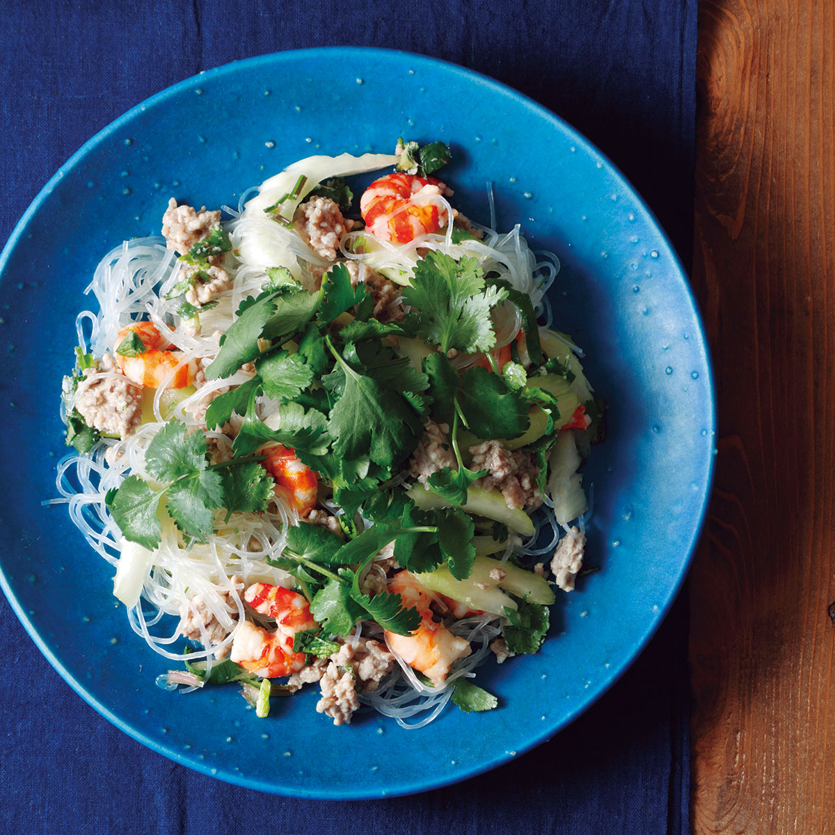 エビと春雨、野菜たっぷりのサラダ。パクチーが加わると一気にタイの気分に。
