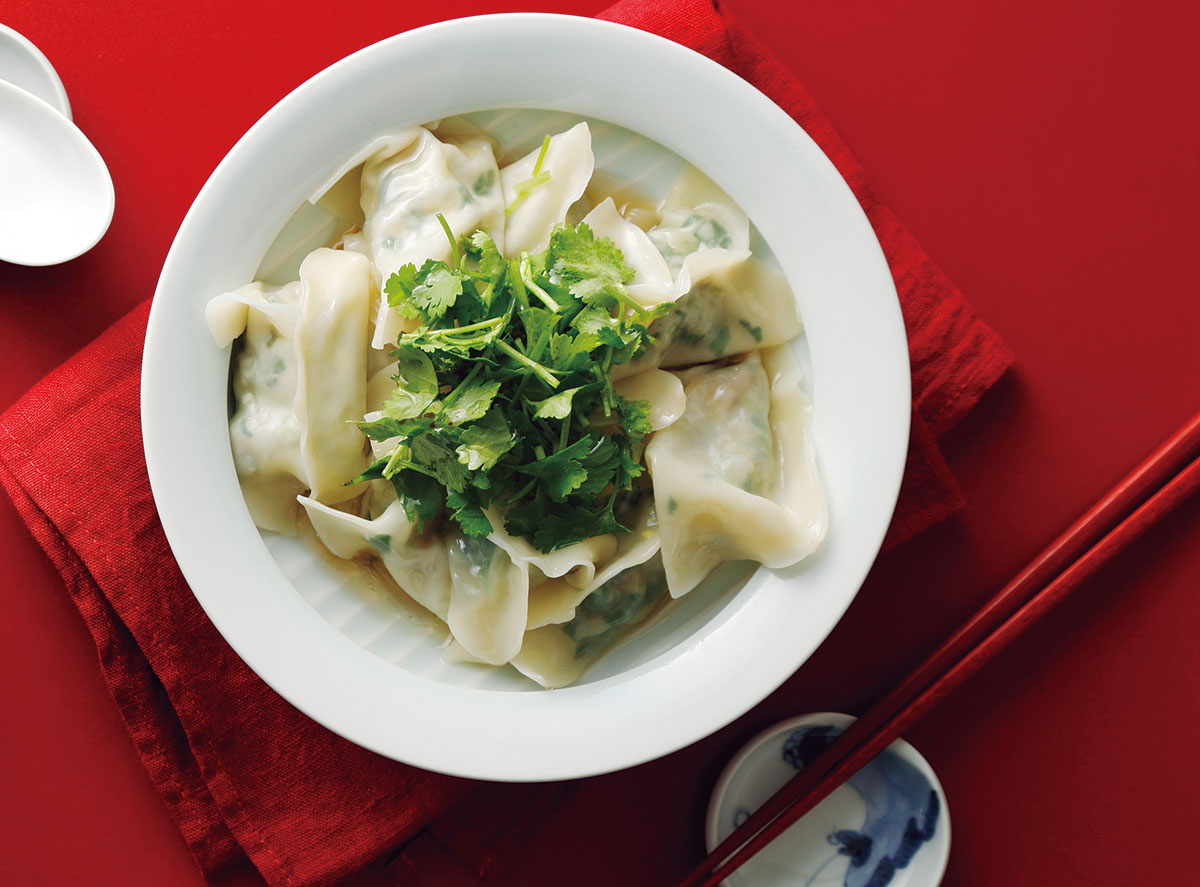 4. 鍋に湯を沸かし、3を約2~3分ほどゆで、ザルに上げて水気を切り、器に盛ってごま油を回しかける。ざく切りにしたパクチーを添え、お好みで酢醤油や香醋などを付けて食べる。