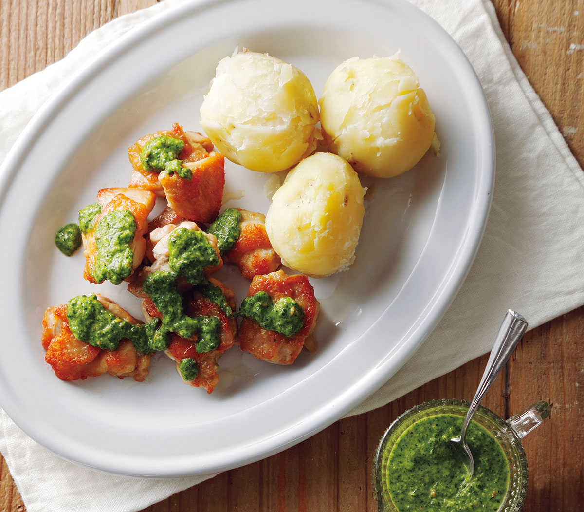 2. 鶏肉は食べやすいサイズに切り、塩コショウ少々(分量外)をふり、オリーブオイル(少々・分量外)を熱したフライパンで両面を焼く。ジャガイモはゆでる、またはラップをして電子レンジでやわらかくなるまで蒸し、皮をむく。