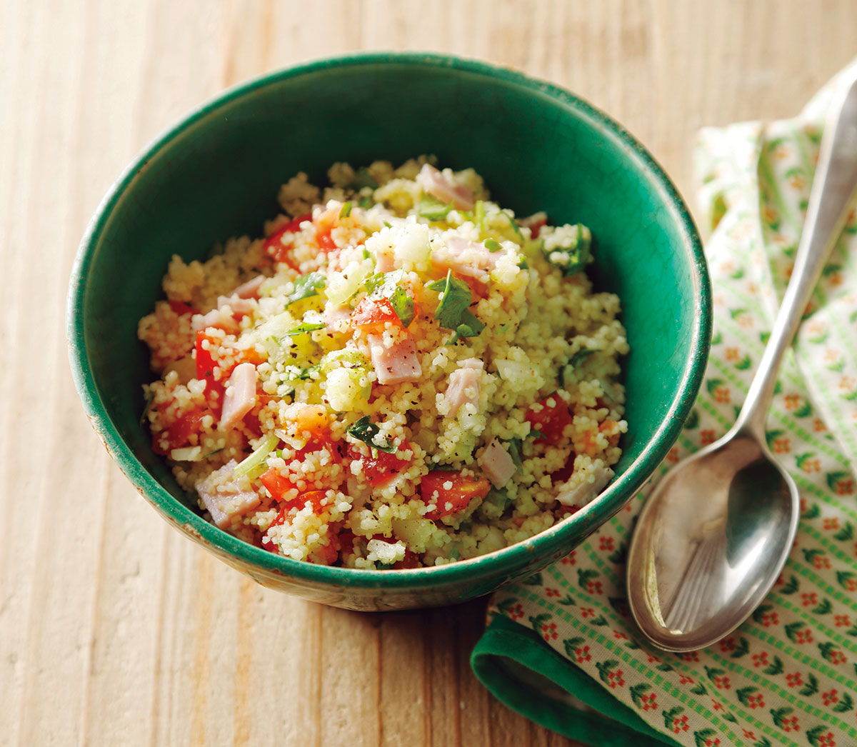 1. クスクスはボウルに入れ、熱湯を200ml加えて混ぜ、蓋をして蒸らす。柔らかくなったら蓋を外して冷ます。野菜、ハムは細かいみじん切りにする。