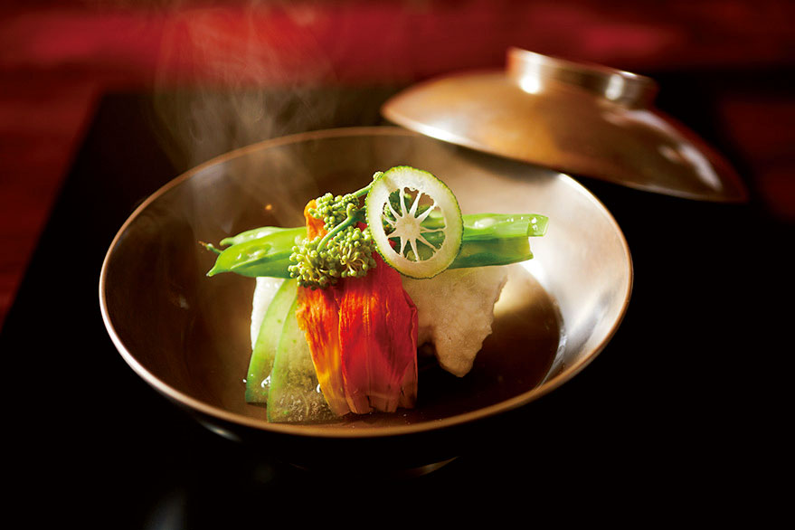 たとえば向付に使用するお造りは鯉。古来より祝儀の席を彩った縁起物を、三ヵ月地下水で泳がせて清らかにした後、細作りをはじめ、四季折々の野菜と合わせている。身だけではなく、真子は木の芽煮に、鱗は素揚げして大徳寺納豆と合わせる等、余すところなく使うのは「料理人の都合で食材を捨てるのは殺生と同じ」という氏の哲学が現れている。さらに、夏の風物詩である焼物の鰻は、蒸さずに焼く伝統的な関西流。約20分、炭火の直火でじっくり焼き上げ、皮目をしっかり焼き切ることで脂を落とし、強肴に使う牛肉は、北海道の十勝で野草を食べて育った体脂肪率10パーセントの野生牛。たんぱく質は素材を吟味した上で野菜や野草と調和するように仕立てているのだ。