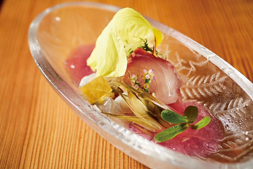 根菜のお盆で供された炊合わせは、賀茂茄子。ひと口食べると厚く締まった果肉から濃厚な味わいとともに夏の香りが広がり、自家製の白味噌餡がさらりとした甘みを加えている。散りばめられた二色のパプリカといんげん豆は短冊、素揚げした山椒葉は笹に見立てられ、れんげの琵琶を爪弾いて、七夕に願いが叶うかどうかはなすがまま。軽妙な言葉と力強い野菜の味に頬を緩ませながら、気が付いた。華やかな香りを放つ山椒の木の芽は春先に出回るもののはず。